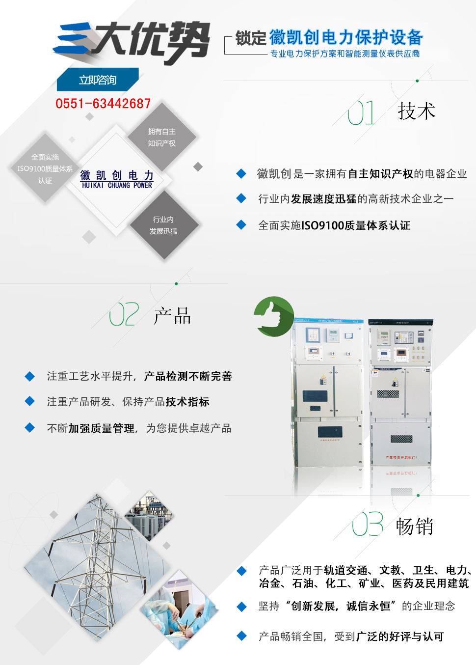 安徽徽凱創(chuàng)電力保護設備有限公司主要從事新型電氣設備、電子設備、智能控制技術的產(chǎn)品研發(fā)、生產(chǎn)、銷售。主要產(chǎn)品有:智能型消弧消諧裝置、消諧過電壓抑制柜、 組合式過電壓保護、智能型開關柜智能操控裝置、微機消諧、小電流選線、電弧光保護裝置、智能在線絕緣監(jiān)測裝置等電氣產(chǎn)品。 產(chǎn)品廣泛用于石化、煤炭、電力、建筑、市政、機場、鐵路、醫(yī)院、學校等領域,受到用戶一致好評。